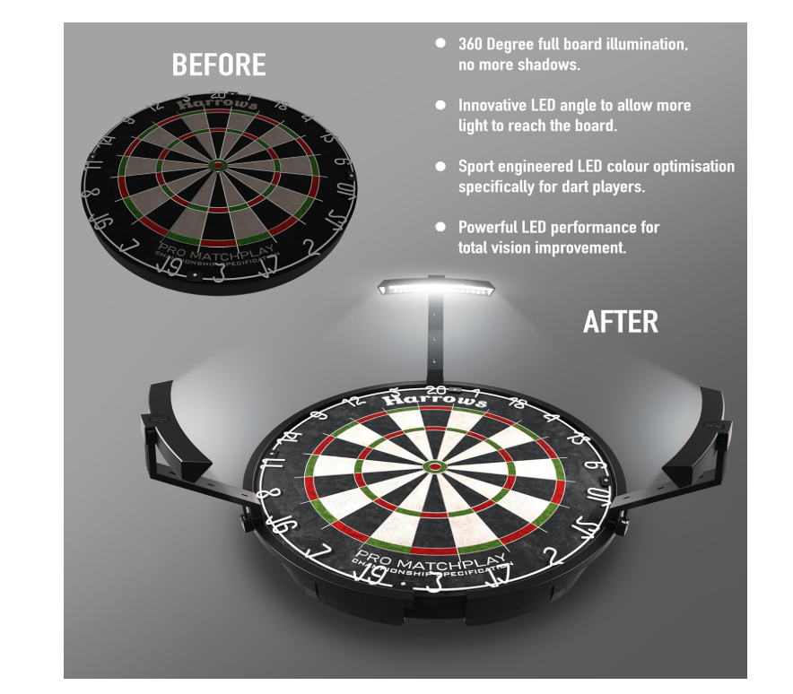• 360° Shadowless Dartboard Lighting – Powerful LED ring light delivers full dartboard illumination with zero shadows – perfect for precision throws and optimal visibility in any environment.