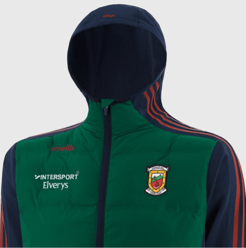 Discover the O’Neills MAYO GAA Kids’ Hydra Lightweight Hooded Padded Jacket . Whether you’re heading to training or cheering from the stands, our jacket delivers comfort and county pride. The padded body provides lightweight insulation to keep your core warm, while the performance fabric sleeves, side panels, and hood offer enhanced flexibility & breathability. The showerproof finish offers protection in light rain, making it perfect for unpredictable conditions. With elasticated cuffs and waistband for a secure fit, plus two zipped side pockets for convenient storage, this jacket is both practical and stylish. Complete with stripe detail along the sleeves, and the MAYO GAA crest, our Hydra Lightweight Hooded Padded Jacket is a performance-focused layer, engineered for warmth, flexibility, and weather resistance.